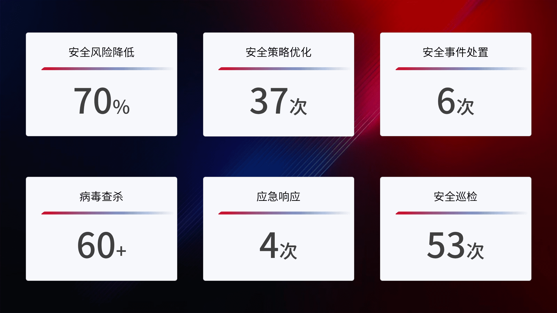 提供全面的安全事件报告体系,,包括处置报告、、周报、、、季度和年度总结,,,,结合持续监控,,帮助客户深入了解网络安全状况。。。。